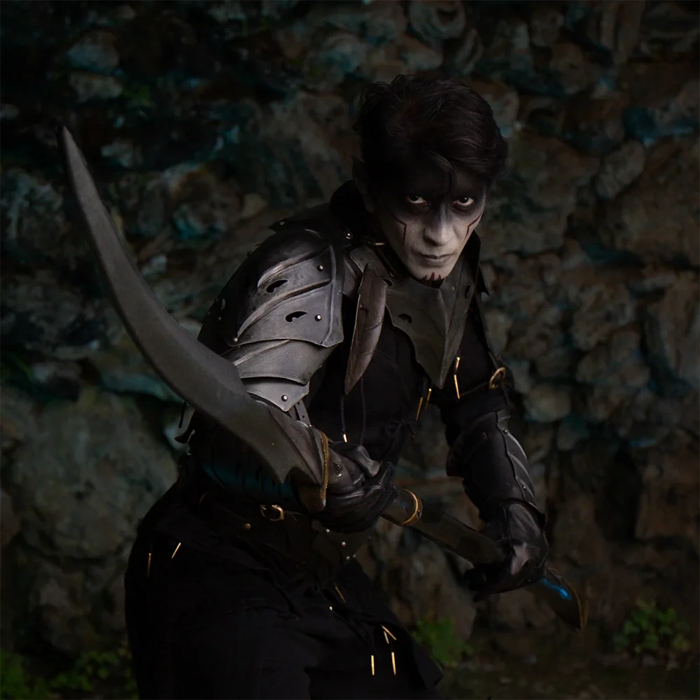 The dark elf moved silently through dim corridors in the forest's depths. Clad in shadowy armour, his eyes glowed like embers. Pausing, he touched his curved glaive, readying for the surface world. He applied an elixir to mask his presence, scenting of earth and decay. Ascending, he emerged into sunlight; senses alert to every sound and rustle. With his glaive in hand, he stepped into the unknown, driven by a gritty determination to navigate the unfamiliar terrain, ensuring his enigmatic legacy persisted in the world above.