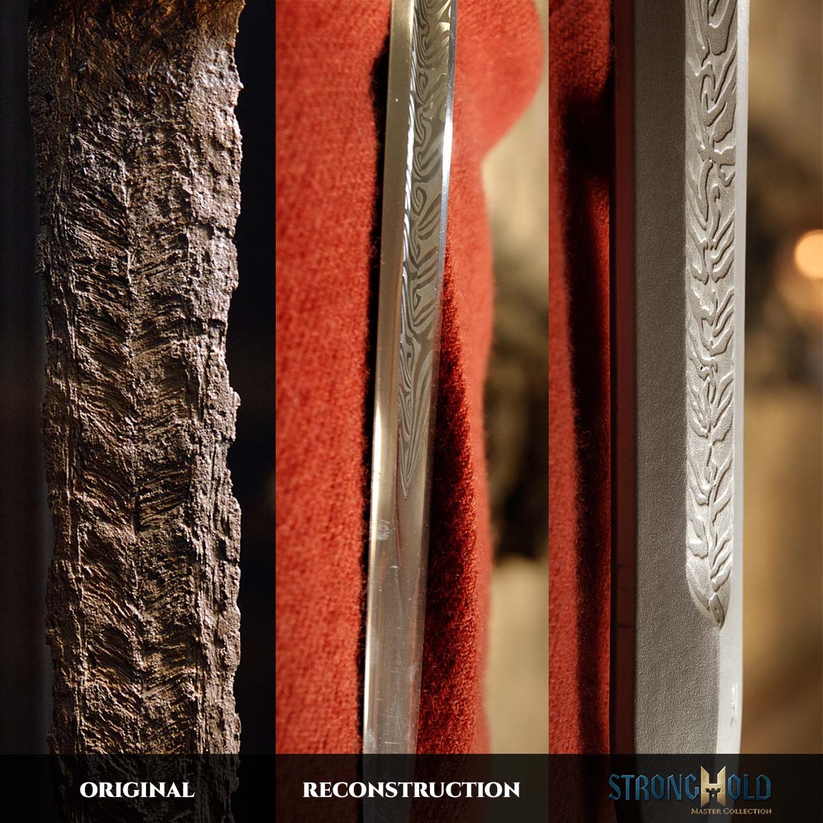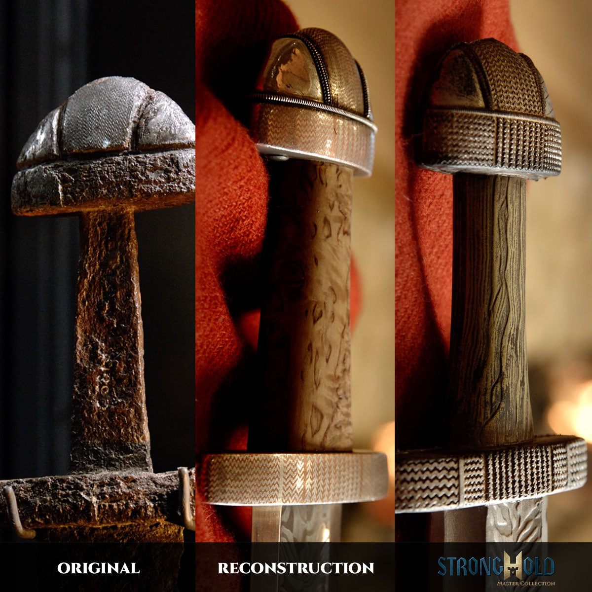 Upon a closer inspection of the Osted Sword, the central part of the blade glistens in the light as if demanding attention and awe. It is an arrow pattern that points towards the tip of the sword, constituting two bands of pattern welding – a technique where the smith folds iron and steel with differentiating carbon content to get the desired hardness and properties. The process also creates a distinct cosmetic effect in a flame-like pattern that most wealthy Vikings seem to have coveted. Pattern welding is an arduous technique and demands – today, as in the Viking Age – an exceptionally skilled artisan to master. A sword fit for a master collection!